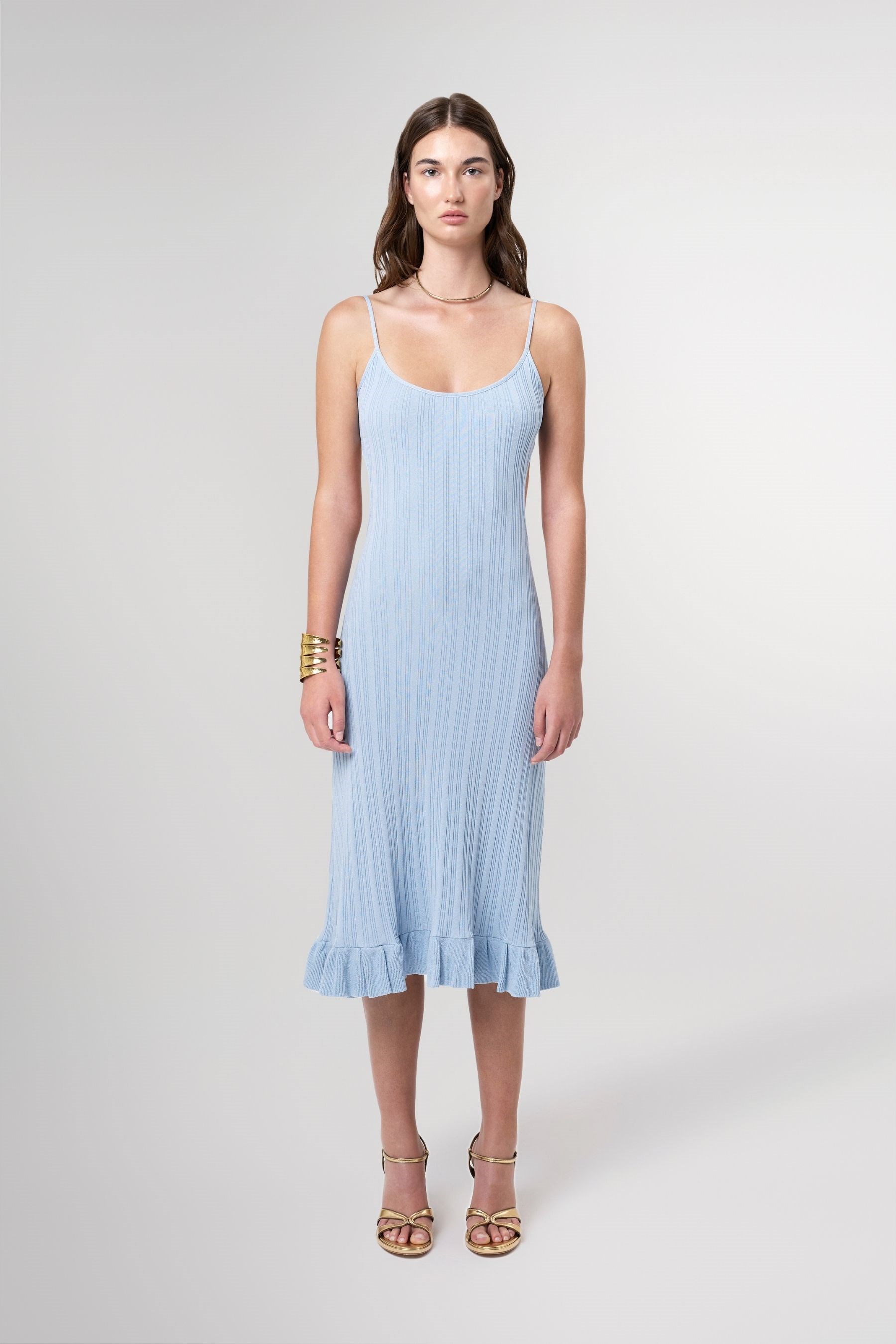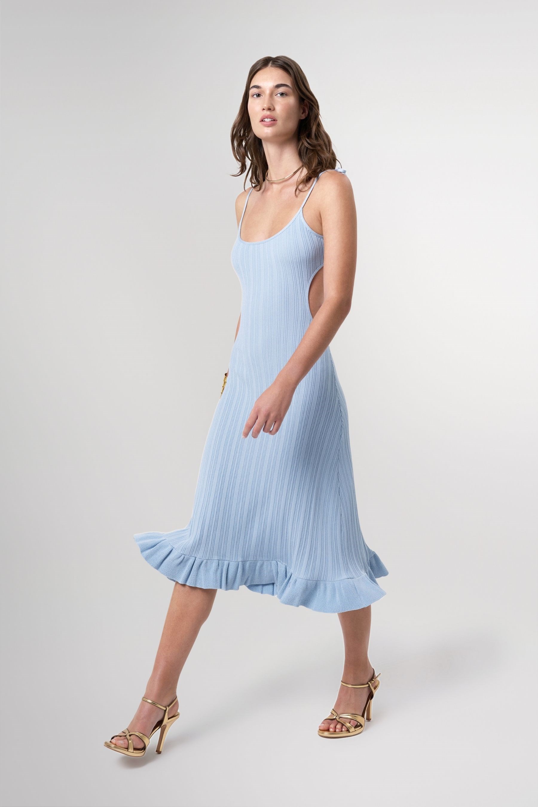 Crafted from a lightweight ribbed knit, it gently follows the body while allowing natural movement. The delicate straps and open sides create a refined, airy feel, while the subtle flared hem with a soft ruffle adds a feminine touch.