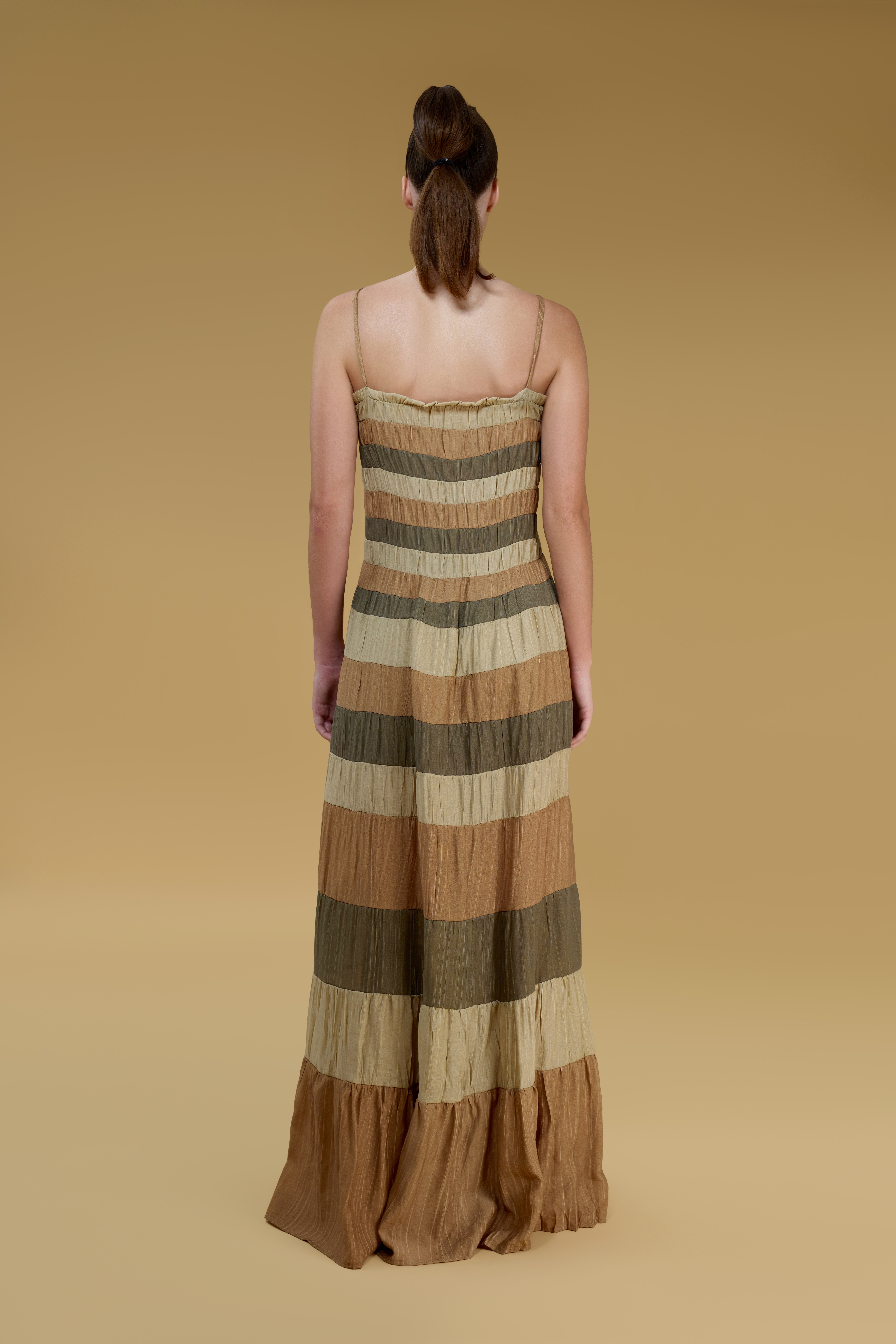 Effortlessly bohemian and versatile, the Phoebe Top is designed in a flowing patchwork of earthy stripes. Featuring a tie-front detail and maxi-length silhouette, it can be worn as a statement top or a lightweight cover-up. Its airy fabric blend makes it perfect for warm summer days and balmy evenings.