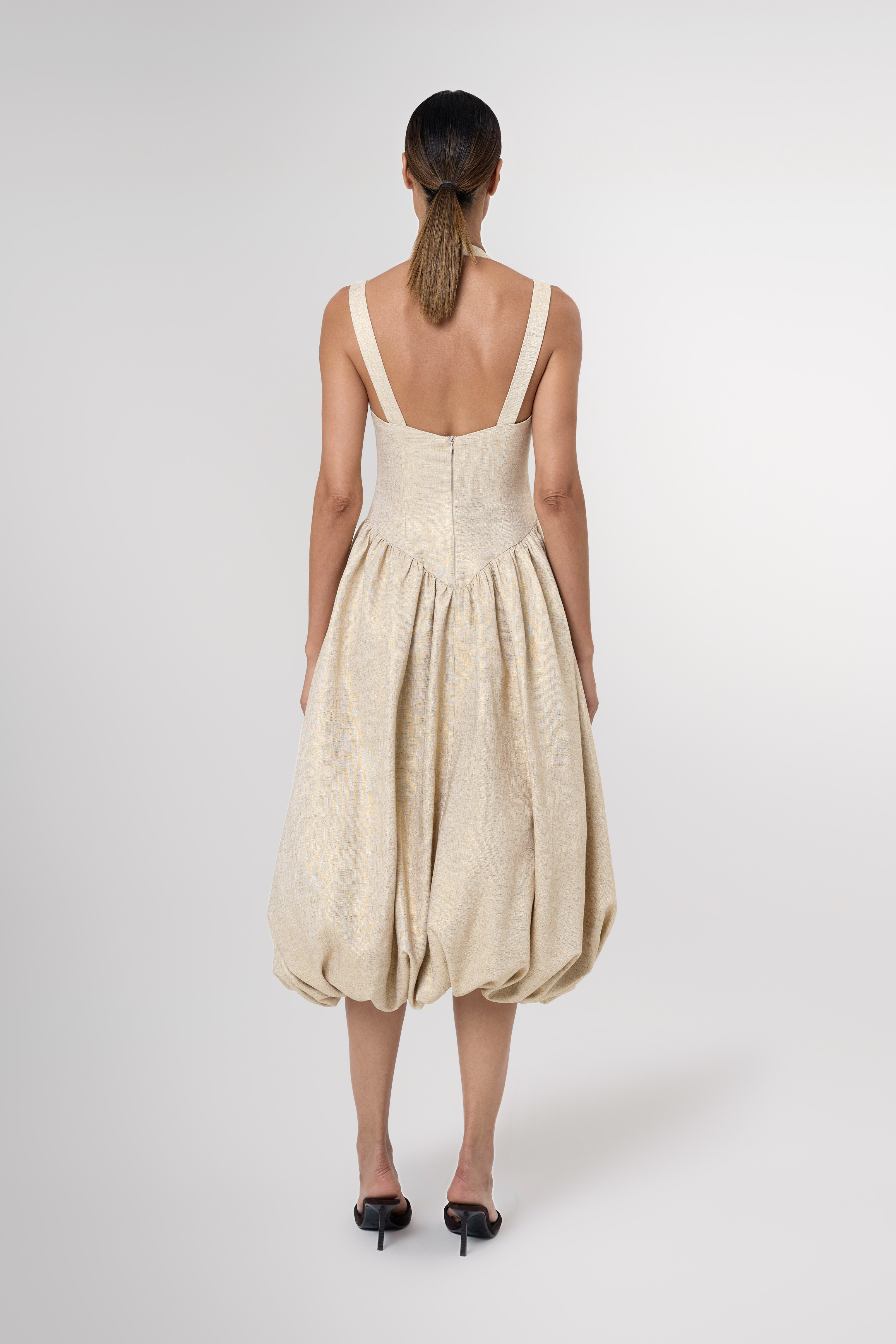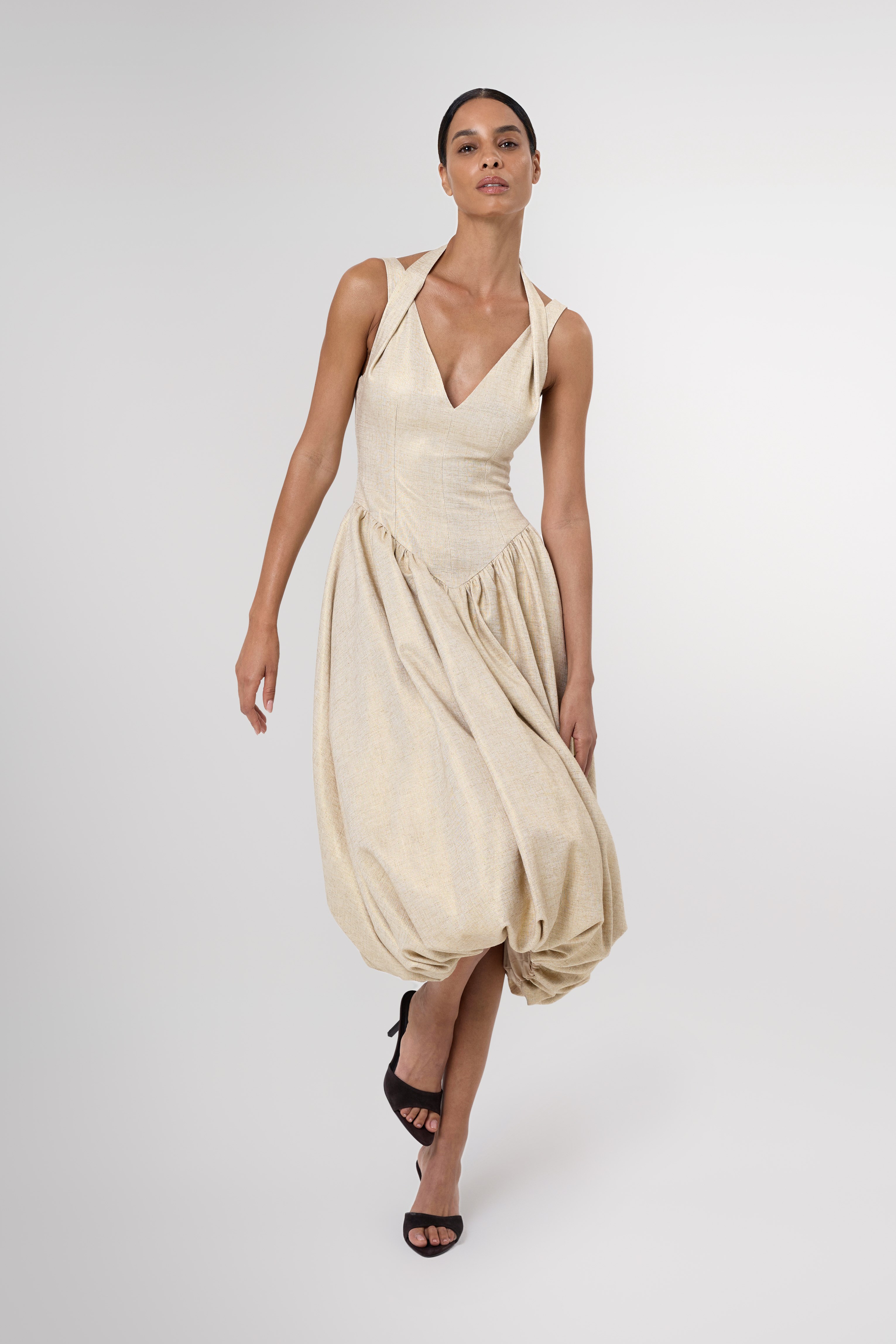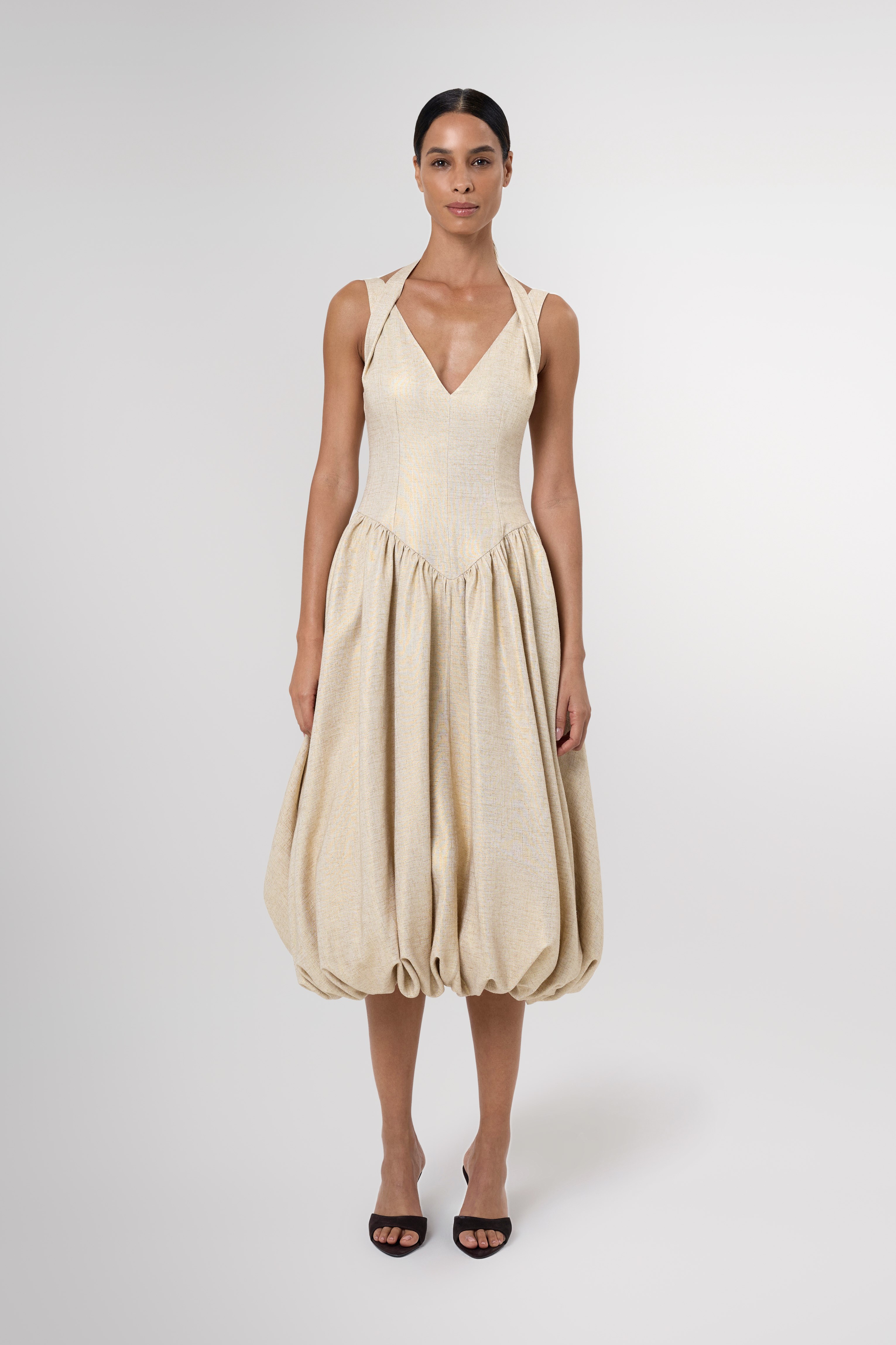Modern yet timeless, the Anok Drop Waist Bubble Hem Midi Dress is crafted from 100% linen with a subtle gold shimmer, giving it a soft, luminous finish. It features a structured bodice and a dropped waist that flows into a voluminous bubble hem for a sculptural silhouette.