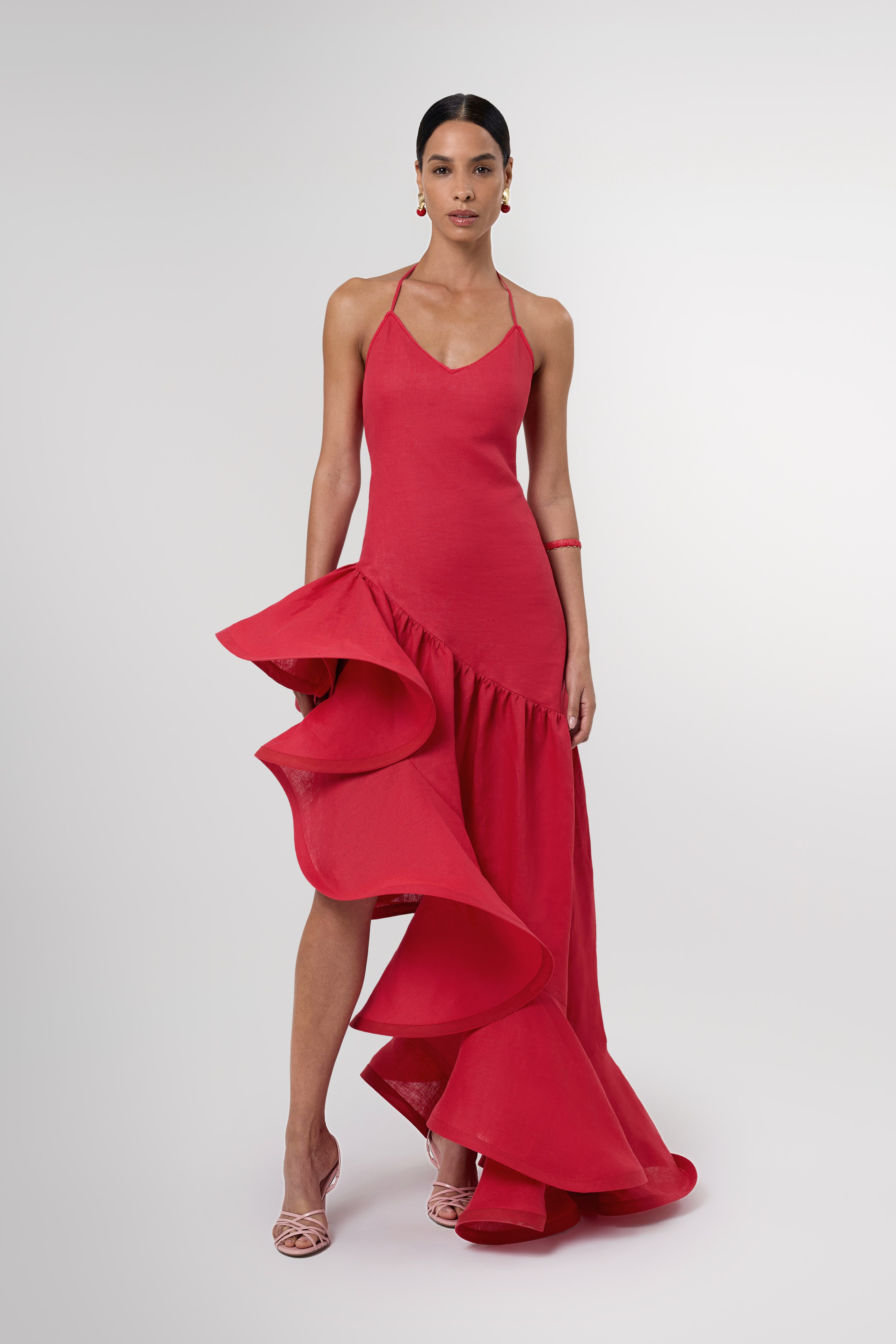 Bold and sculptural, the Sahra Red Asymmetric Structured Linen Maxi Dress is designed to make a statement at special events. Crafted from 100% linen, it offers a breathable yet structured feel that holds its striking silhouette beautifully.