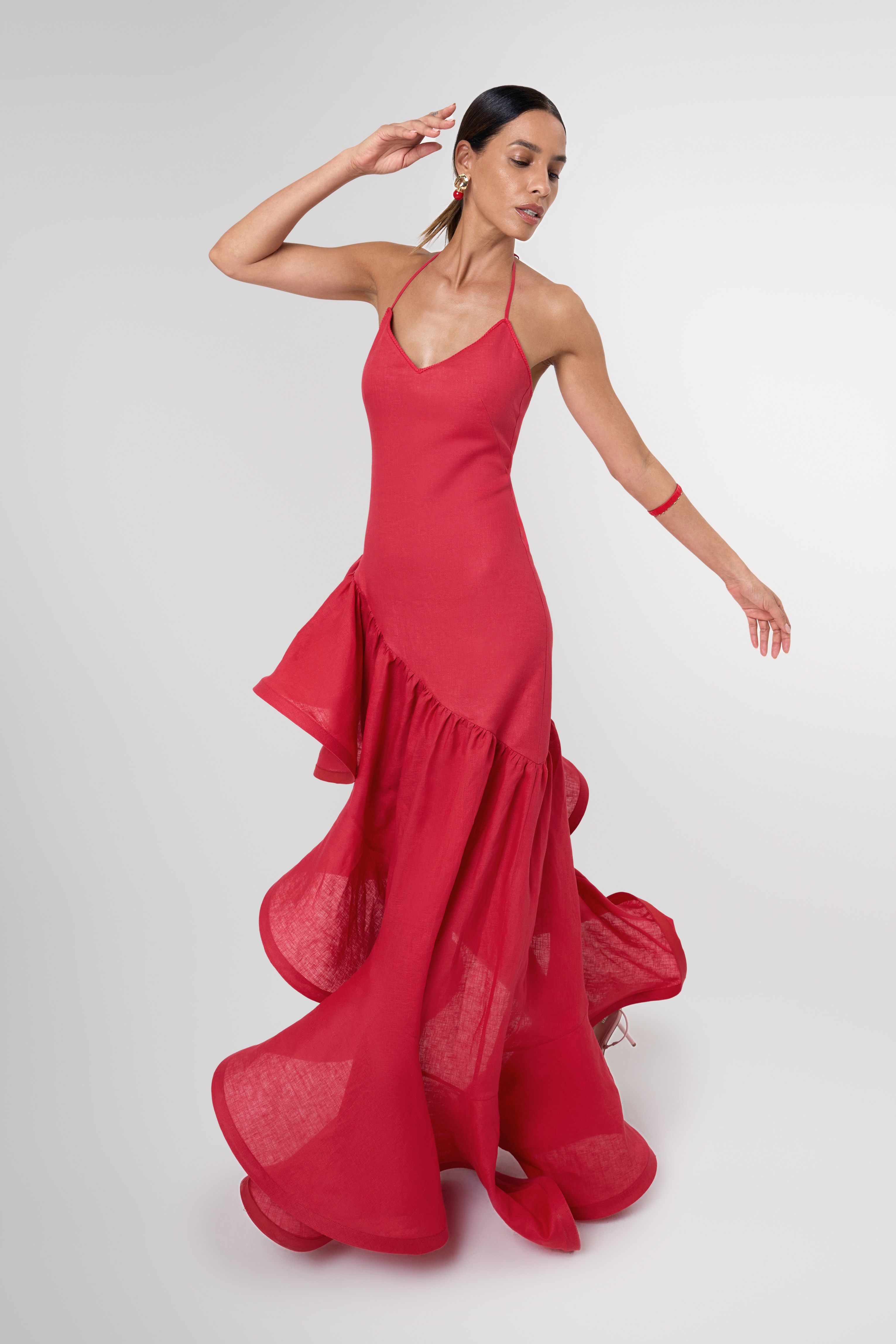 Sahra Red Asymmetric Structured Linen Maxi Dress